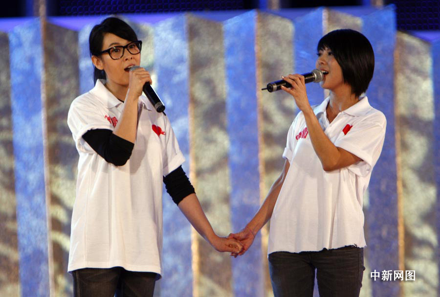 “跨越海峽的愛心”——大陸同胞援助臺灣“莫拉克”臺風受災同胞賑災晚會在北京舉行。眾多文體界明星在現場亮相,獻出一片愛心。圖為劉若英和許茹蕓在晚會現場獻唱。中新社發 杜洋 攝
