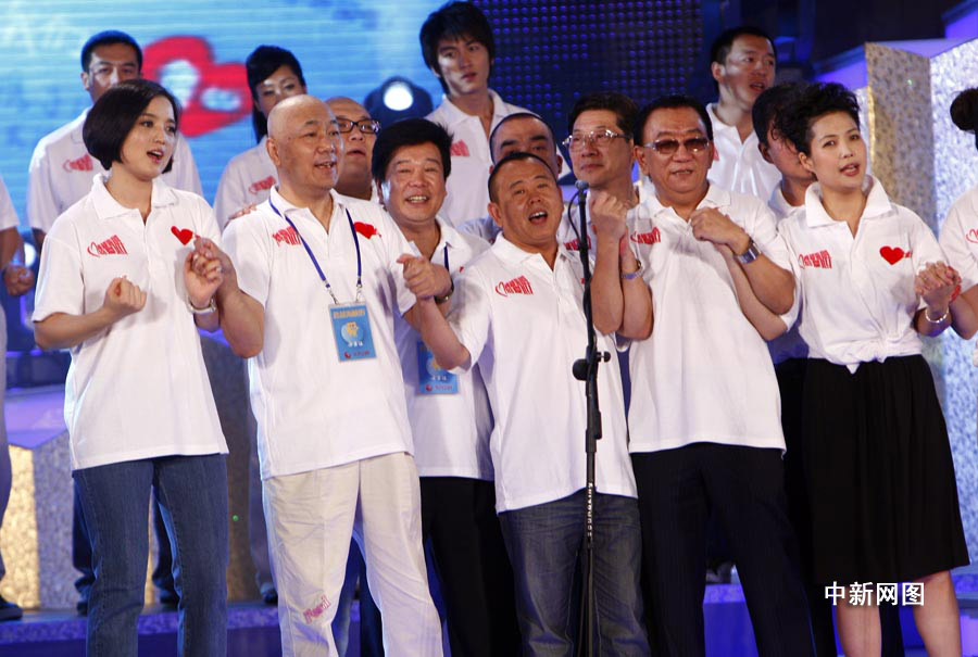 “跨越海峽的愛心”——大陸同胞援助臺灣“莫拉克”臺風受災同胞賑災晚會在北京舉行。眾多文體界明星在現場亮相,獻出一片愛心。圖為侯耀華、潘長江等在晚會現場演出。中新社發 杜洋 攝