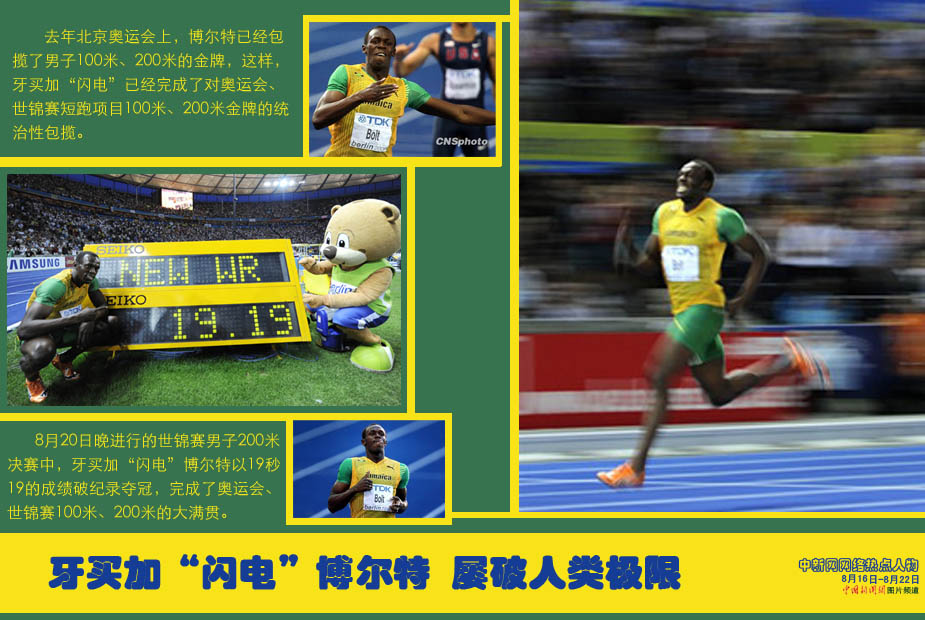 中新網(wǎng)本周熱點人物之——博爾特 第12屆國際田徑聯(lián)合會世界田徑錦標賽男子200米決賽在柏林奧林匹克體育場舉行,已經(jīng)獲得100米冠軍并打破世界紀錄的牙買加超級名星博爾特以19.19秒的成績獲得冠軍并打破世界紀錄。