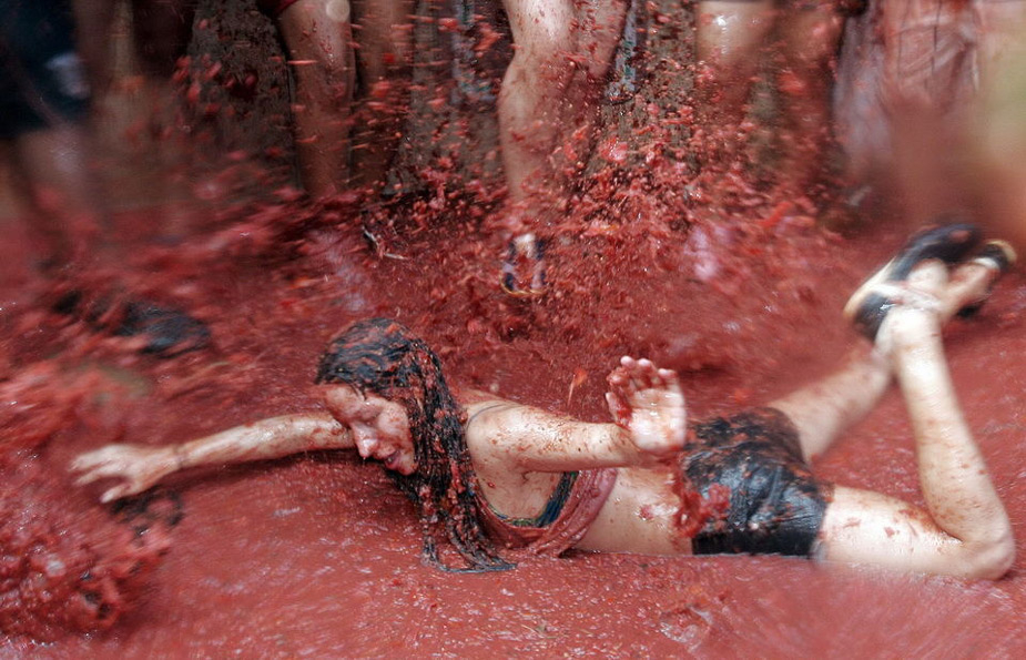 8月26日,西班牙東南部小鎮Bunol當日迎來傳統的西紅柿節。大約4萬名狂歡者在1小時內扔掉了11萬公斤西紅柿。來源:中國新聞網