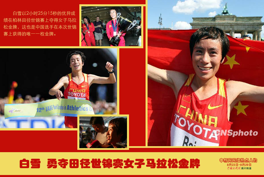 中新網(wǎng)本周熱點(diǎn)人物之——白雪 白雪以2小時(shí)25分15秒的優(yōu)異成績在柏林田徑世錦賽上奪得女子馬拉松金牌,這也是中國選手在本次世錦賽上獲得的唯一一枚金牌。