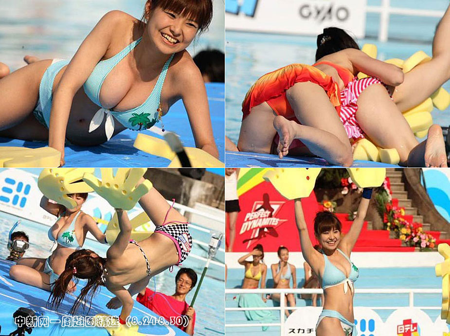 炎炎夏日,日本的比基尼美女們。在水上來一場趣味摔跤大賽,令人體會到夏日的激情,又不失一分涼爽。圖片來源:金羊網