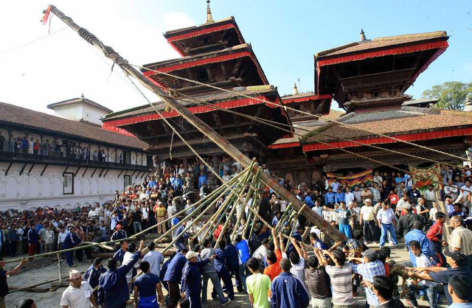 圖為節日當天舉行豎立因陀羅旗桿(經過密宗儀式并修飾過的一棵樹干)的儀式。