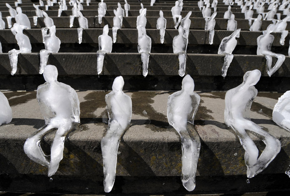 9月2日,德國柏林,世界野生動物基金會(WWF)將1000個小冰人被放置在了御林廣場音樂廳的臺階上,小冰人慢慢融化成水。活動的組織者希望此舉能引起公眾對于全球變暖的關注。來源:中國新聞網