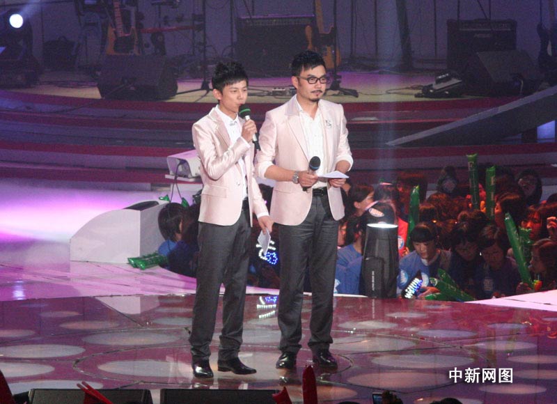 9月4日,湖南衛(wèi)視“2009快樂女聲”進(jìn)行最后的總決賽。江映蓉、黃英、李霄云這3強(qiáng)選手將通過18首歌曲的演繹,向全國總冠軍發(fā)起最后沖擊。圖為主持人何炅和汪涵。劉雙雙攝