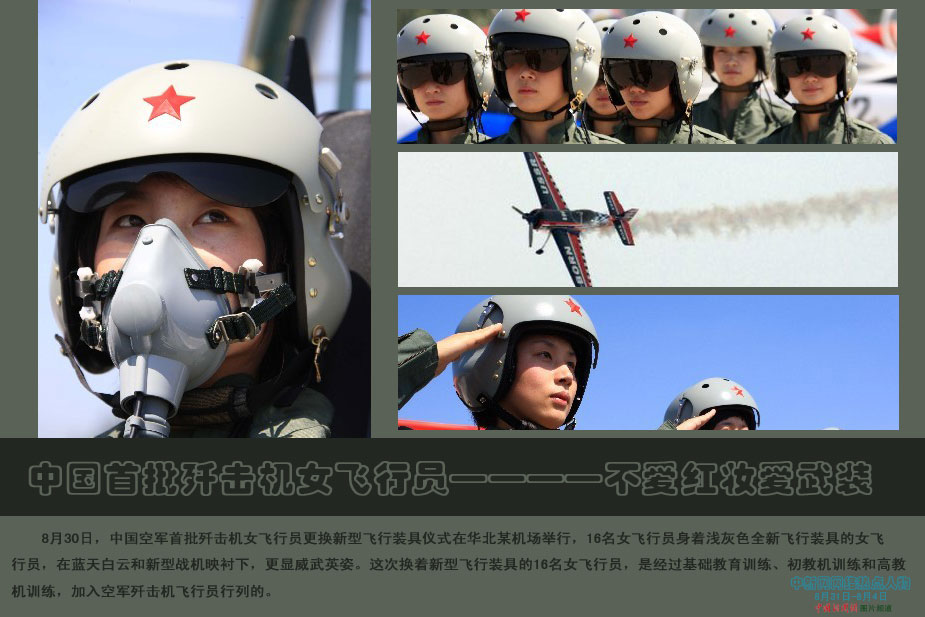 中新網本周熱點人物之——中國首批殲擊機女飛行員 8月30日,中國空軍首批殲擊機女飛行員更換新型飛行裝具儀式在華北某機場舉行,16名女飛行員身著淺灰色全新飛行裝具的女飛行員,在藍天白云和新型戰機映襯下,更顯威武英姿。這次換著新型飛行裝具的16名女飛行員,是經過基礎教育訓練、初教機訓練和高教機訓練,加入空軍殲擊機飛行員行列的。來源:中國新聞網
