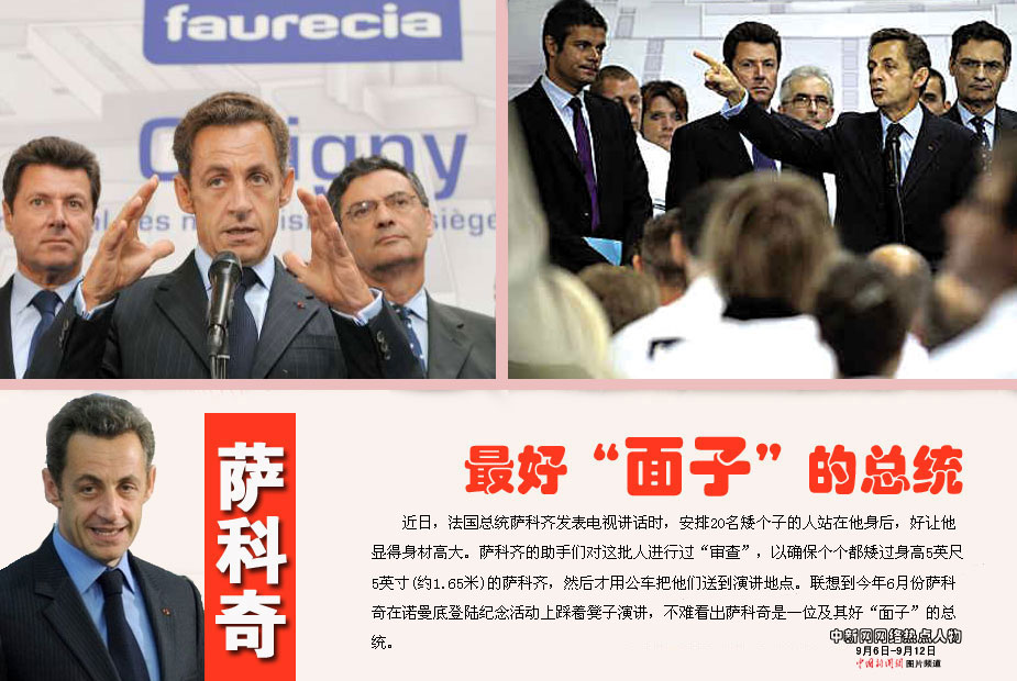 中新網本周熱點人物之——薩科奇 近日,法國總統(tǒng)薩科齊發(fā)表電視講話時,安排20名矮個子的人站在他身后,好讓他顯得身材高大。薩科齊的助手們對這批人進行過“審查”,以確保個個都矮過身高5英尺5英寸(約1.65米)的薩科齊,然后才用公車把他們送到演講地點。聯(lián)想到今年6月份薩科奇在諾曼底登陸紀念活動上踩著凳子演講,不難看出薩科奇是一位及其好“面子”的總統(tǒng)。