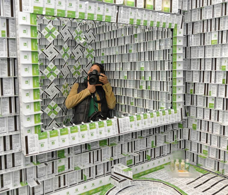 9月17日,在美國紐約,一位名叫布賴恩的設計師展示他利用房門卡設計的客房。這個占地約37平方米的酒店接待大廳、臥室和衛生間是利用20多萬張房門卡搭建而成的。