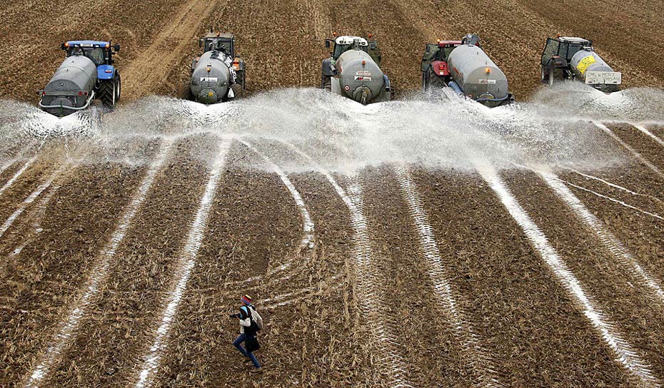 9月16日,比利時奶農向地里傾倒了3百萬升鮮牛奶做“農肥”,抗議奶價暴跌。奶農們認為,提高牛奶生產配額造成歐盟市場上奶制品供大于求,進而引發價格暴跌。圖片來源:中國新聞網