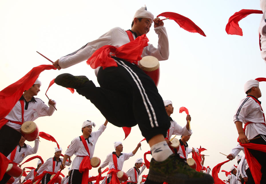 9月16日,千余名來自陜西安塞的腰鼓隊員在北京密云訓練基地首次和其他方陣合練。該方陣隊員全部是來自陜西省延安市安塞縣的農民,10月1日他們將走在群眾游行隊伍中,在天安門城樓前舞起安塞腰鼓。該方陣也是群眾游行隊伍中唯一一支京外隊伍,唯一一個全部由農民組成的方陣。杜洋 攝 圖片來源:中國新聞網