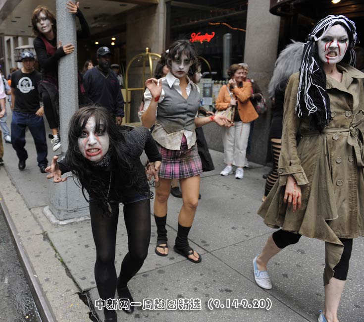 當(dāng)?shù)貢r(shí)間9月16日,在美國紐約時(shí)代廣場(chǎng),一群演員裝扮成僵尸的樣子,在街頭行走,提前為下個(gè)月到來的萬圣節(jié)造勢(shì)。圖片來源:中國新聞網(wǎng)
