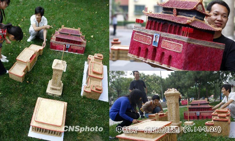 為迎接祖國60華誕,四川青年理發(fā)師黃鑫用40多公斤碎頭發(fā)制作了一個(gè)微型“天安門廣場”全景模型。圖片來源:中國新聞網(wǎng)
