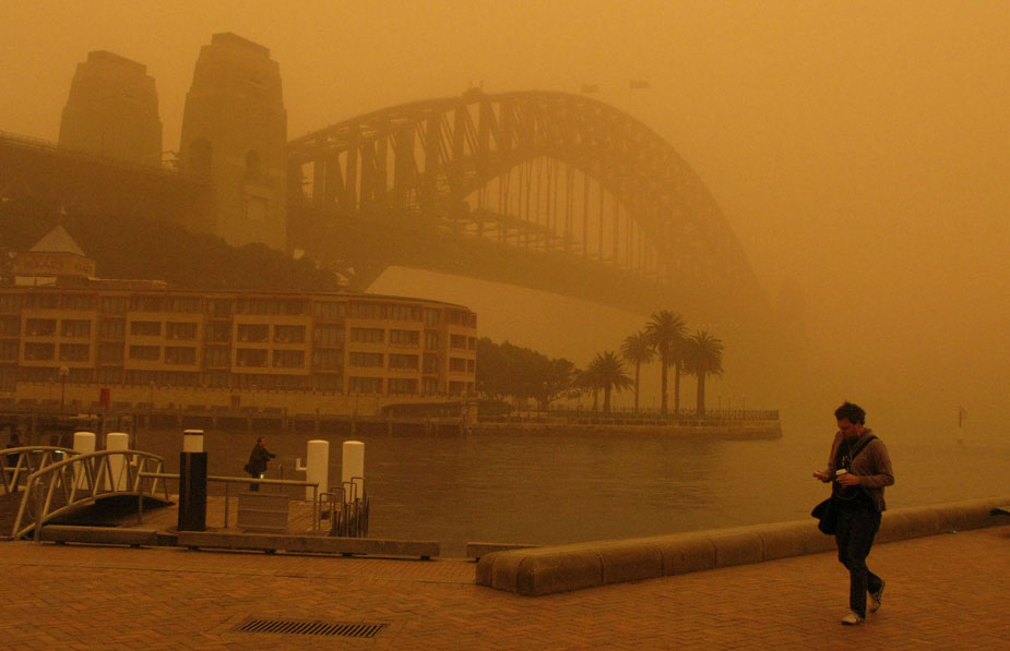 澳大利亞悉尼23日出現罕見的沙塵暴,加上風速每小時上百公里的強風吹襲,全城籠罩在一片橘紅色的塵霧中,由于能見度相當低,飛機和渡輪暫時停飛或停駛。