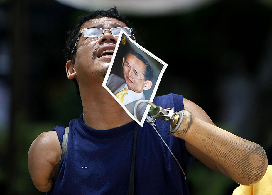 22日,在泰國首都曼谷,一名男子在醫(yī)院外為普密蓬·阿杜德的健康祈禱。 81歲高齡的泰國國王普密蓬·阿杜德于19日因發(fā)燒住進醫(yī)院接受治療。圖片來源:中國新聞網(wǎng)