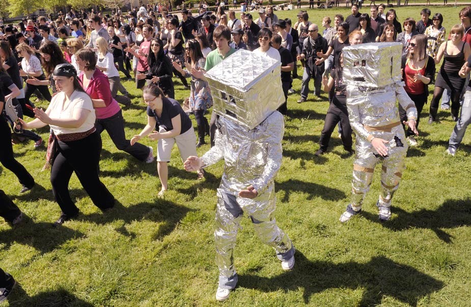 9月29日,379名澳大利亞學生在草坪上齊刷刷地跳起了“機器人舞”,打破了集體跳“機器人舞”的世界紀錄。其中還有一些學生從頭到腳裹上了金屬箔紙,還有一些身穿海盜服裝。此前集體跳“機器人舞”的紀錄保持者是276名來自英國肯特大學的學生。