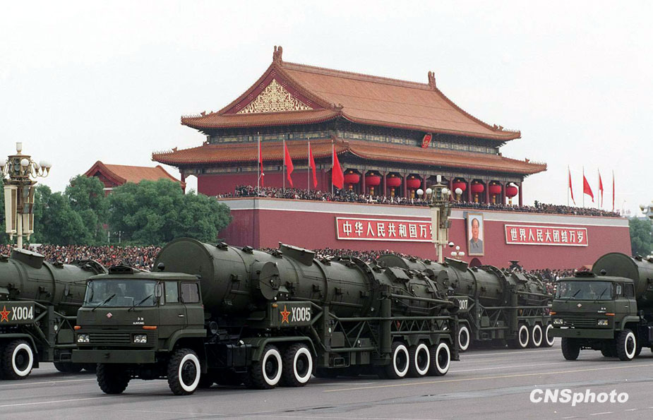 圖為中國第二炮兵部隊裝備的遠程地地核導彈出現在1999年國慶閱兵式上。 中新社發 錢興強 攝