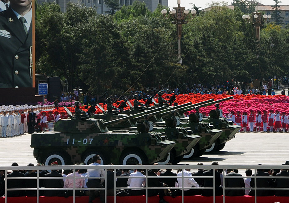 2009年10月1日,中華人民共和國成立60周年慶祝大會在北京天安門廣場舉行。圖為輪式自行迫榴炮方隊(duì)。中新網(wǎng)記者 攝