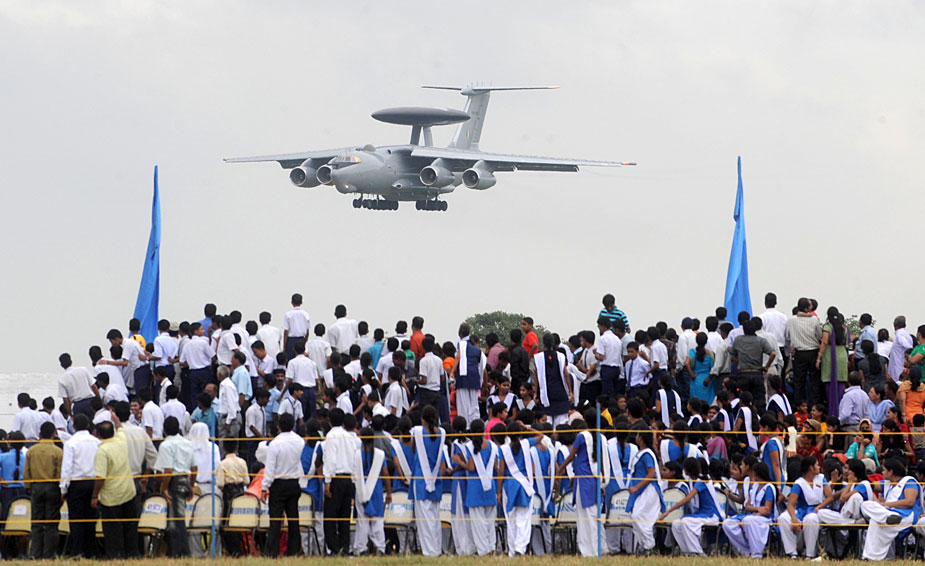 10月6日,印度空軍在新德里郊區的加濟阿巴德地區進行了精彩的飛行表演。這次飛行表演是為了迎接印度空軍建軍77周年慶典舉行的彩排式。圖片來源:中國新聞網