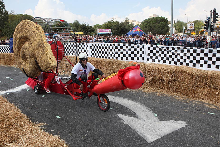 50輛“肥皂盒車”10月7日參加了耶路撒冷舉行的“肥皂盒車”趣味競賽。賽道設(shè)置在市中心一條大街的一段斜坡上,比賽者駕駛各種千奇百怪的賽車從起點(diǎn)一路滑下。圖片來源:中國新聞網(wǎng)