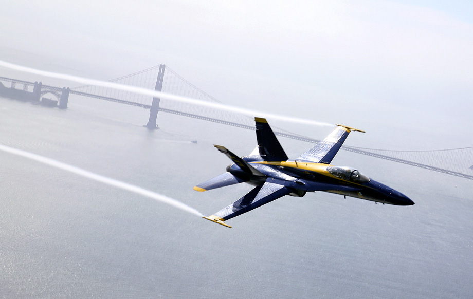 2009年10月8日,美軍飛機在舊金山灣上空進行飛行演練。一年一度的舊金山艦隊周將于10月10日開幕,屆時會有船艦游行和飛行表演等活動。 來源:中國新聞網