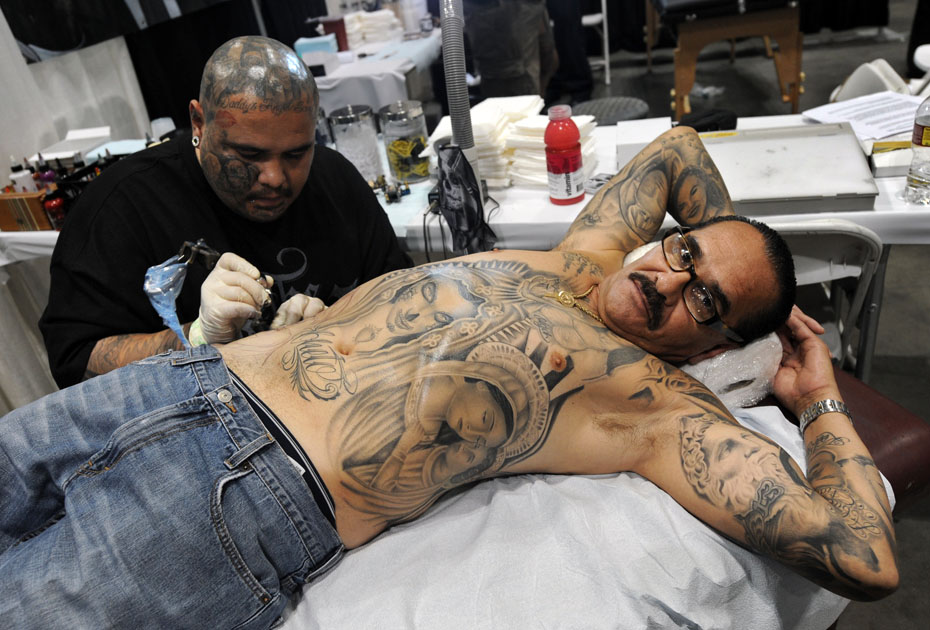 圖為觀眾在人體紋身藝術博覽會上紋身。