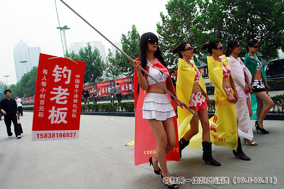 10月9日,鄭州國際會展中心附近5名身穿性感泳裝的美女模特,在這里釣起“老板”。來源:CFP