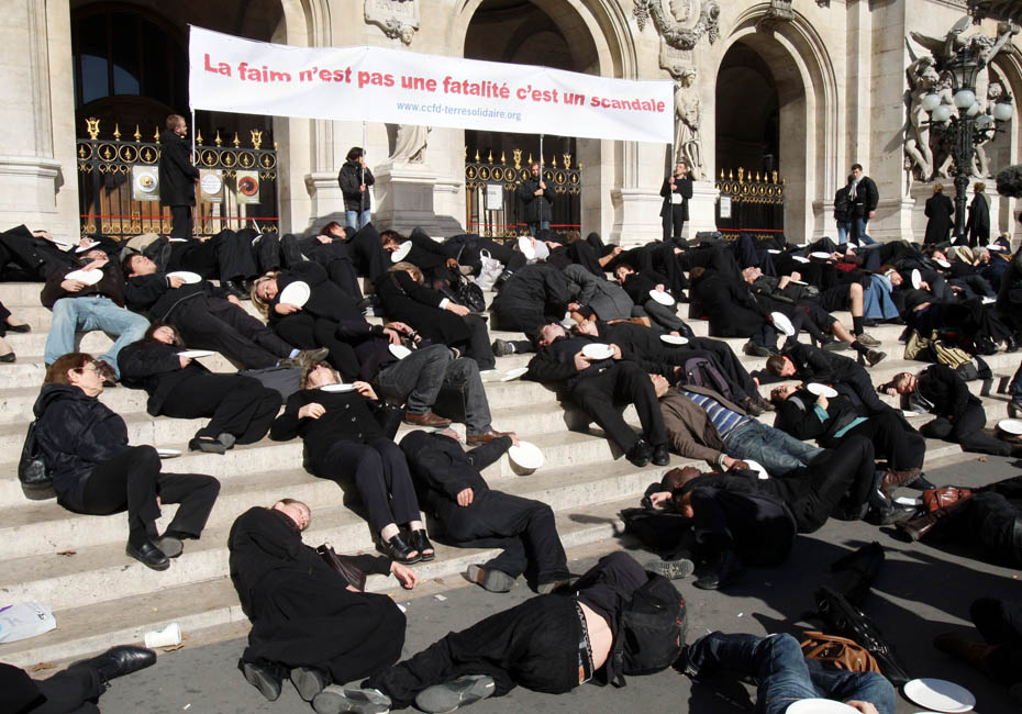 10月15日,示威者身穿黑色衣服、手持空盤子在巴黎歌劇院前抗議。他們此舉是為了呼吁人們關注世界上的饑民。圖片來源:中國新聞網