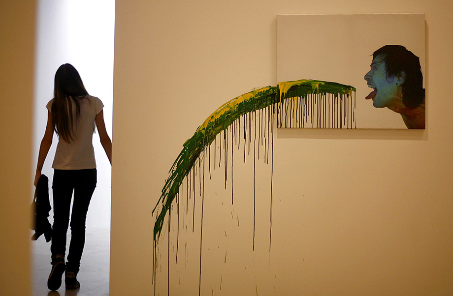 周日(10月11日),塞爾維亞貝爾格萊德舉行的十月藝術沙龍展上,一名參觀者走過一幅藝術作品。圖片來源:中國新聞網