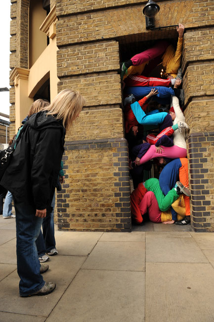 10月16日,來自奧地利的藝術家威利·多勒帶著他的城市空間人體藝術團隊,在倫敦街頭進行藝術表演。幾十位表演者把自己的身體擠進通道入口、壁凹和任何能找得到的公共建筑的縫隙內,供人們欣賞。