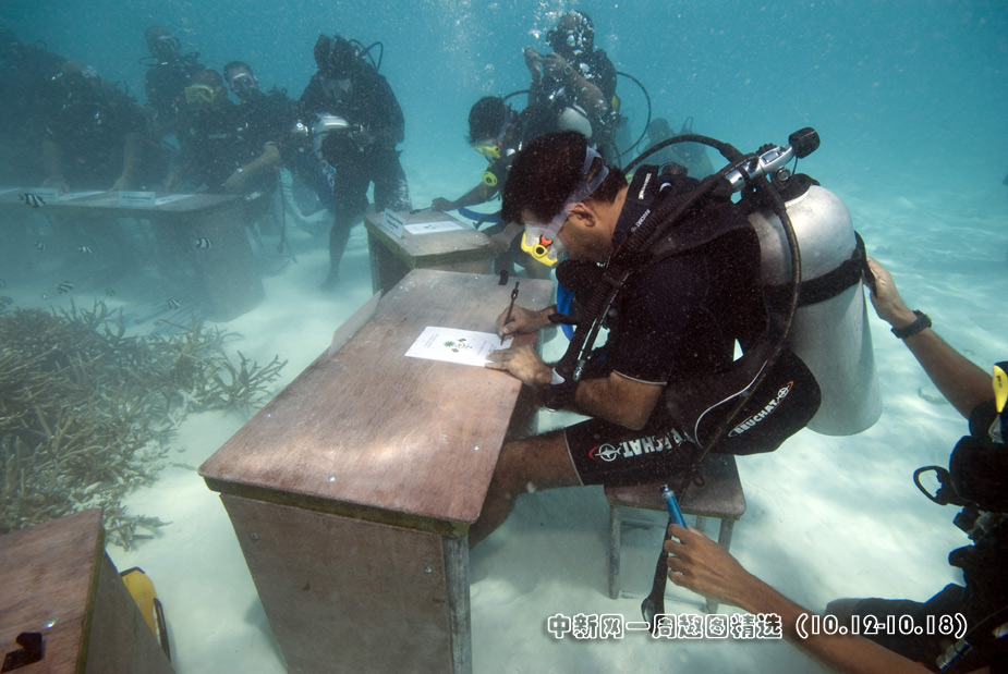 10月17日,印度洋島國馬爾代夫首次在水下召開內閣會議。圖片來源:中國新聞網