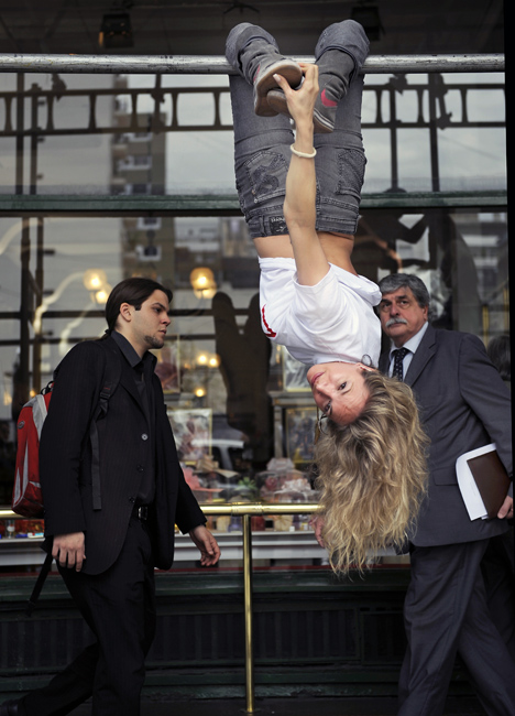 10月19日,阿根廷布宜諾斯艾利斯市街頭,鋼管舞小姐在街頭表演,路邊的路燈、電線桿變身為鋼管舞道具。圖片來源:中國新聞網
