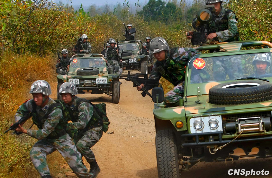 解放軍濟南軍區“前鋒-2009A”軍事演習,將于10月21日在某合同戰術訓練基地舉行,圖為即將參加演習的空降兵部隊10月20日在進行針對性訓練。這次演習主要是由兵力兵器數量規模向信息火力效能聚優轉變、指揮的重心由主攻方向上的重點突破向作戰關節要害的體系毀癱轉變、火力的運用由概略粗放決策向科學精細籌劃轉變、協同的重點由地面步坦行動向陸空火力協調轉變、行動的控制由時間位置推進量向效果態勢達成度轉變、作戰的目的由殲敵奪地向控要制權轉變。 中新社發 宋吉河 攝