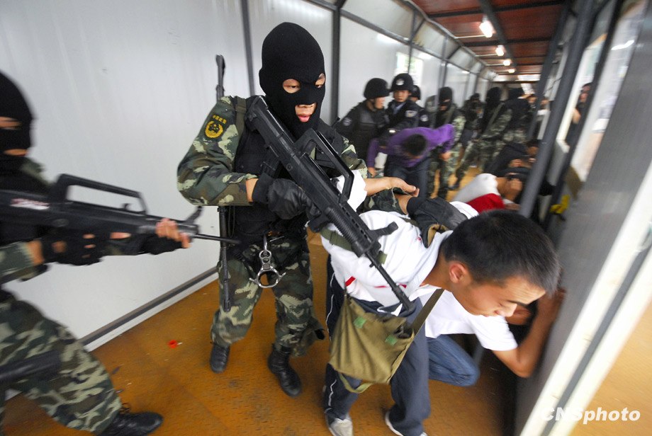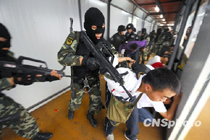 10月23日下午3時(shí)40分,推進(jìn)“平安重慶”建設(shè)突發(fā)事件應(yīng)急演練在該市渝中區(qū)大田灣體育場(chǎng)舉行,重慶各警種突精銳力量重裝登場(chǎng),將各類(lèi)事件一一化解。圖為反劫持戰(zhàn)術(shù)演練中,武警特種作戰(zhàn)分隊(duì)、特警總隊(duì)突擊分隊(duì)發(fā)起攻擊,一舉捕殲了“恐怖分子”。 中新社發(fā) 郝飛 攝