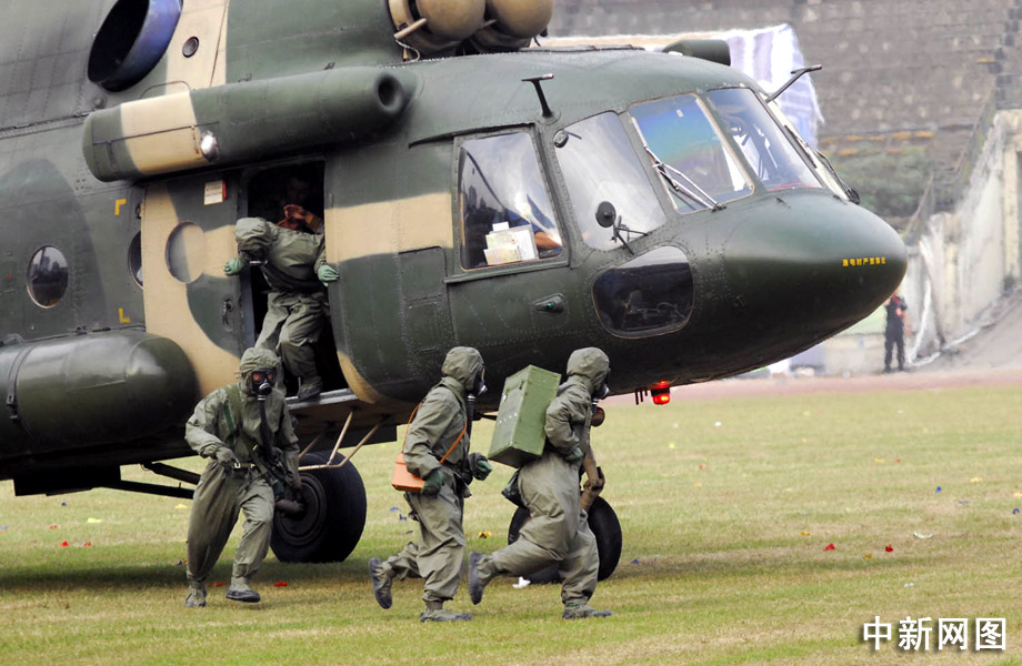 首先趕到現(xiàn)場的是一架米—171直升機,4名防化偵察員全身防護狀態(tài)下依次著陸。著陸后,其中2人實施先期偵察,簡單了解情況后對商場外空氣、進出道路及商場外部設(shè)施進行偵察,初步查明遭襲情況,并采集收取樣品;另外2人指導公眾防護并協(xié)助組織撤離危害區(qū)。 郝飛 攝