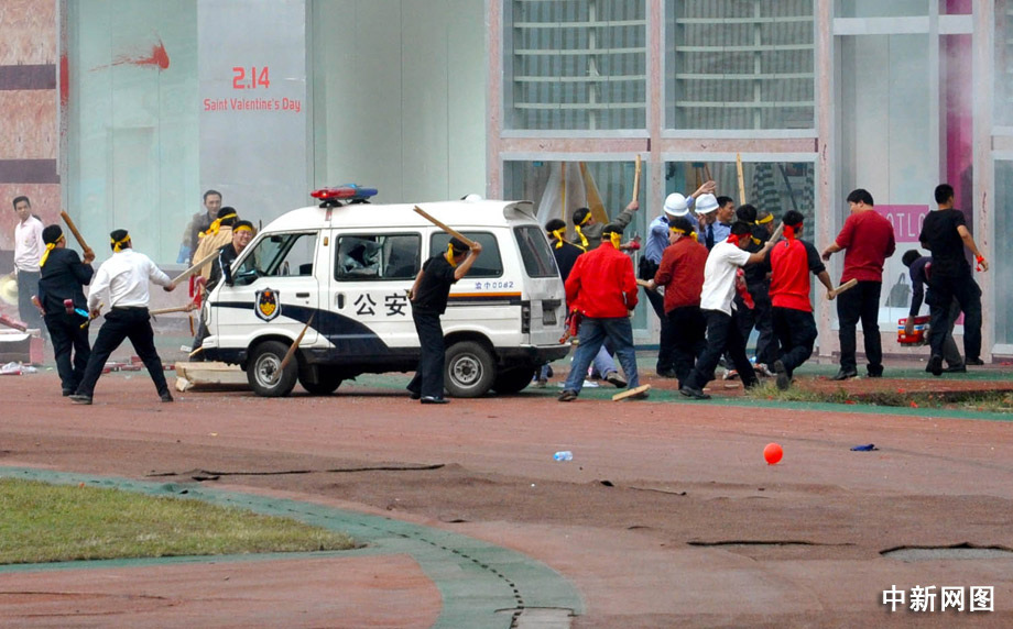陸續涌來的“暴徒”,帶來了鐵棍、長刀、鐵鏈等兇器,并結伙圍打執勤民警,出現摔、砸商業設施和投擲礦泉水瓶等行為,在廣場上出現了反動標語,“暴徒”不斷叫囂反動語言,引發附近眾多群眾圍觀,鬧事人群已達200余人。曹多然 攝