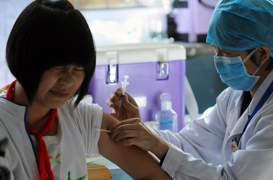 周三(21日),北京市朝陽區垂楊柳中學初一(2)班的學生正在接種甲型H1N1流感疫苗。從當天起至12月31日期間,北京市的中小學生、老人等五類重點人群,在知情自愿的原則下,將免費接種甲流疫苗。中新社發 侯宇 攝