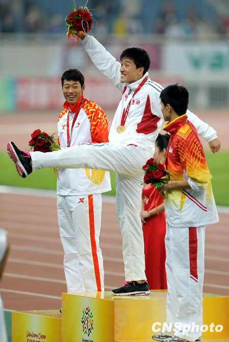 10月25日,在全運會田徑男子110米欄決賽中,上海代表團選手、“中國飛人”劉翔以13秒34的成績勇奪冠軍,同時也成就了其全運會該項目三連冠的偉業(yè)。 中新社發(fā) 陳文 攝