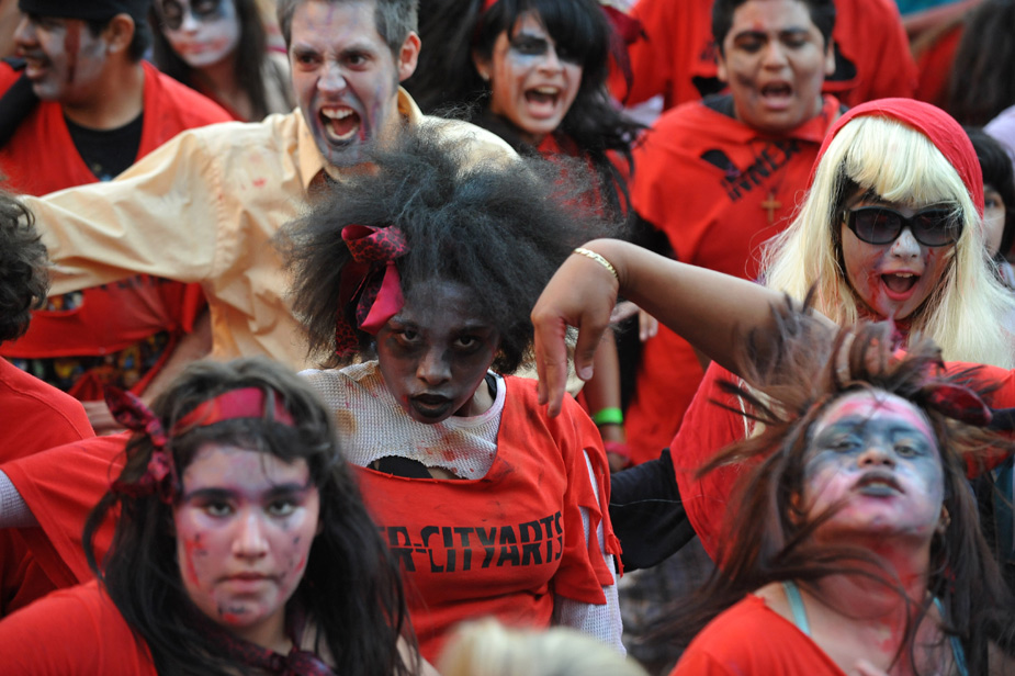 25日,“戰栗全世界”活動在全球300多座城市同期舉行,全球一共有大約20000人同時跳起了邁克·杰克遜著名的戰栗舞。歌迷們借此表達了對這位流行音樂之王的哀思。并且刷新了全世界最多人同時跳舞的世界紀錄。圖為在美國洛杉磯,歌迷跳起“戰栗舞”。