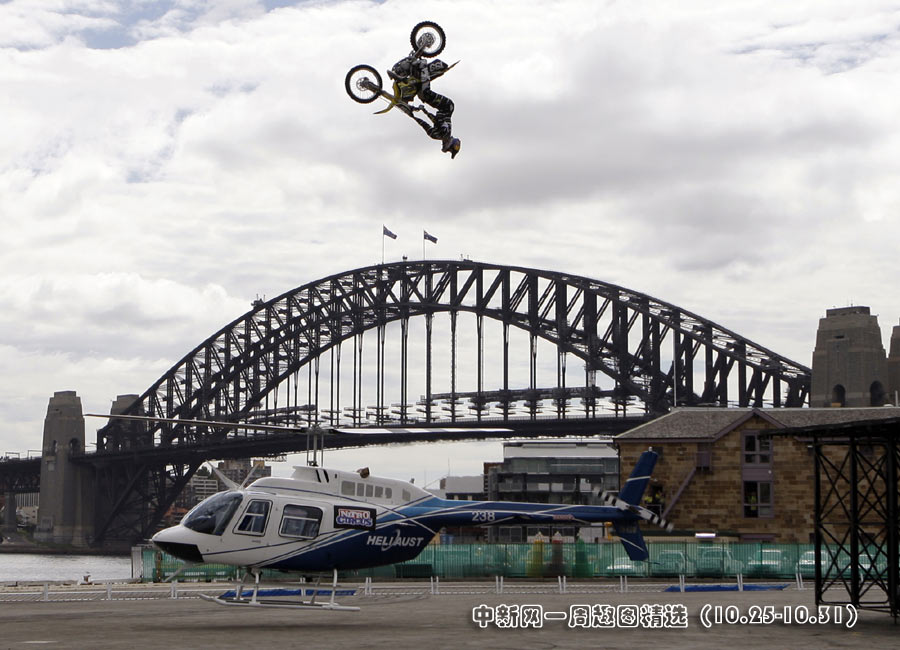 10月28日,在澳大利亞悉尼著名的港灣大橋附近,美國人特拉維斯·帕斯切拉駕駛摩托車成功從一架盤旋的直升機上空飛過。特拉維斯是一位著名的極限運動玩家,此次是為一個電視節目做推廣。>>點擊觀看詳細內容