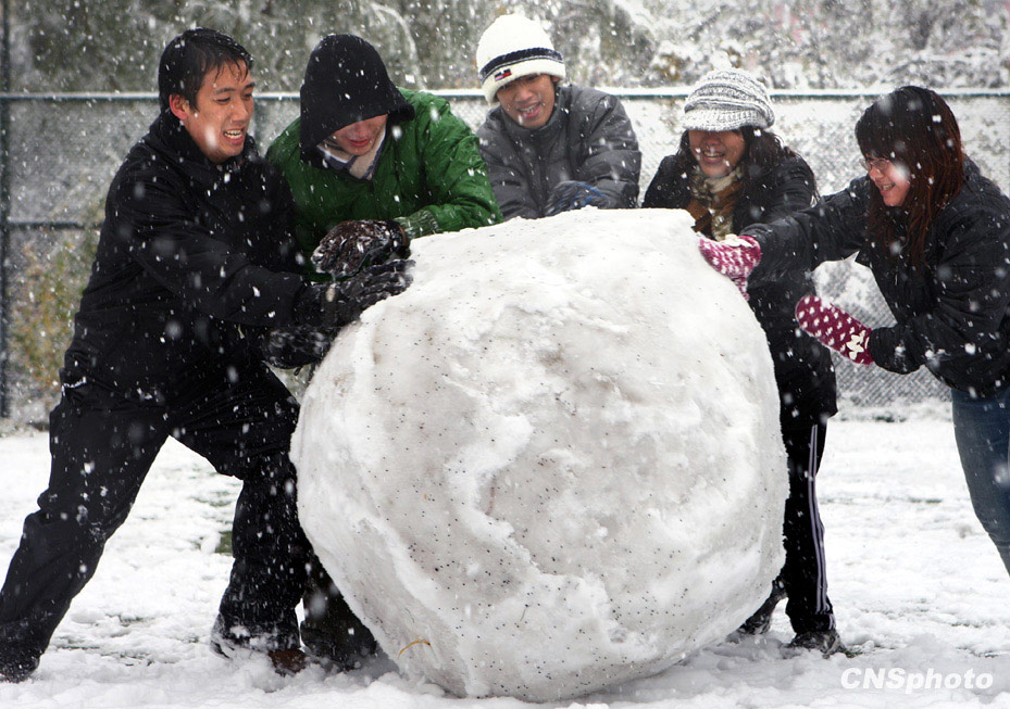 11月1日農歷九月十五,尚未立冬的北京受強冷空氣影響大雪紛飛銀裝素裹,幾名來自赤道印尼的年輕人滾起碩大的雪球享受罕見的雪中樂趣。受強冷空氣影響,北京從昨天夜間開始出現小雨,今天凌晨轉為大雪,午后降雪逐漸減弱。根據過去50年的數據統計,北京地區常年出現初雪的時間在每年的11月29日左右,今年的初雪時間提前了整整一個月。中新社發 任晨鳴 攝