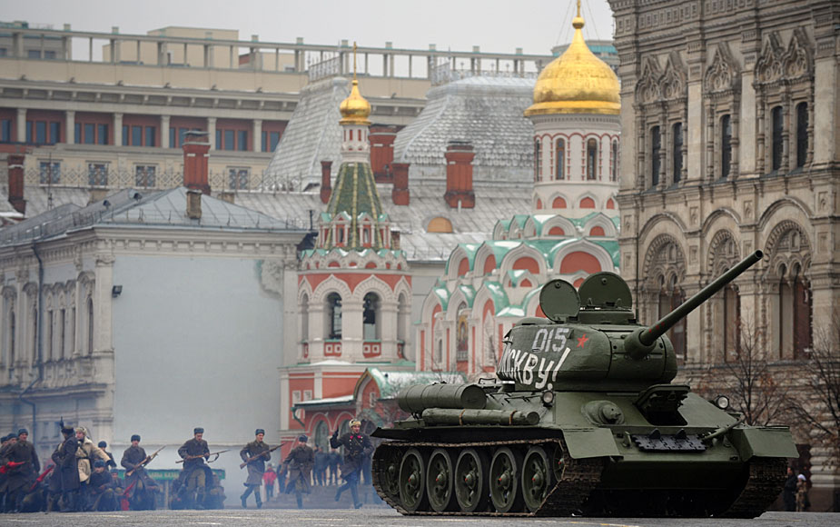 11月7日,俄羅斯士兵身穿二戰時期的軍服在莫斯科紅場舉行閱兵閱兵式紀念1941年紅場閱兵。圖片來源:中國新聞網