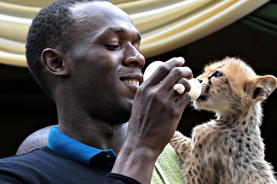 周一(2日),牙買加“飛人”博爾特在肯尼亞野生動物中心收養了一只3個月大的小獵豹,并給其取名為“閃電博爾特”。來源:中國新聞網