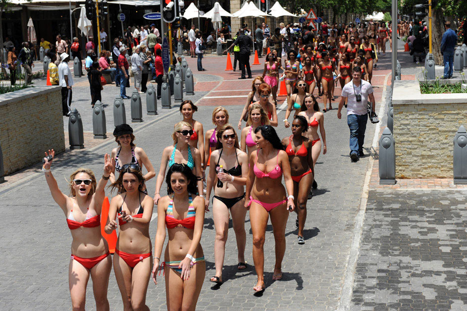 11月7日,南非的約翰內斯堡正值夏天,將近300位身穿比基尼泳裝的女郎齊聚游行。希望借此打破最大規模比基尼游行吉尼斯紀錄。