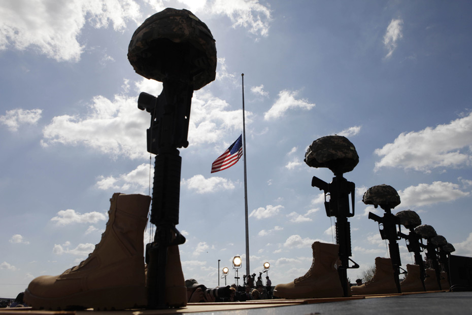 2009年11月10日,美國德克薩斯州胡德堡陸軍基地舉行儀式悼念槍擊案遇難者。 圖片來源:中國新聞網