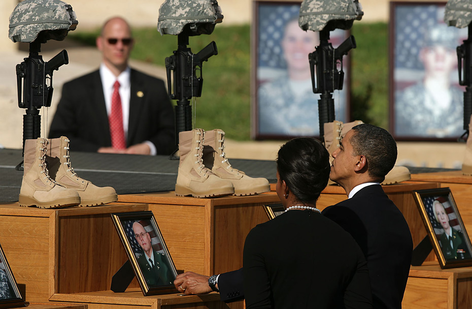 2009年11月10日,美國德克薩斯州胡德堡陸軍基地舉行儀式悼念槍擊案遇難者。美國總統奧巴馬和第一夫人米歇爾出席。 圖片來源:中國新聞網