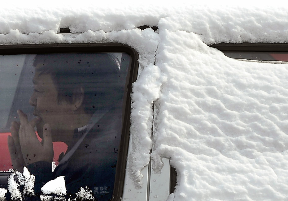 圖為一個人坐在大雪覆蓋的汽車內。