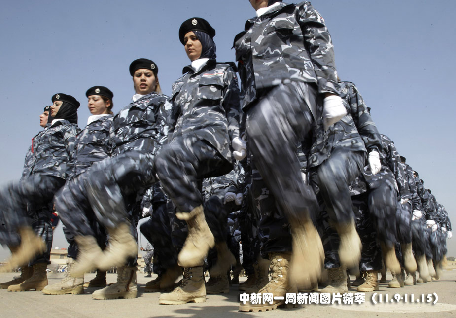 9日(周一),美國培訓的新一批伊拉克警務人員,經過專定的警察科目培訓后正式畢業,其中還包括50名女警察。她們將參加巴格達的警察部隊。圖片來源:中國新聞網