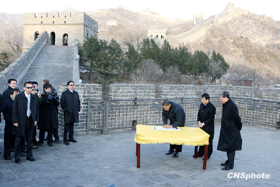 11月18日,美國總統(tǒng)奧巴馬游覽北京八達(dá)嶺長城。圖為奧巴馬在參觀長城后題詞留念。中新社發(fā) 任晨鳴 攝