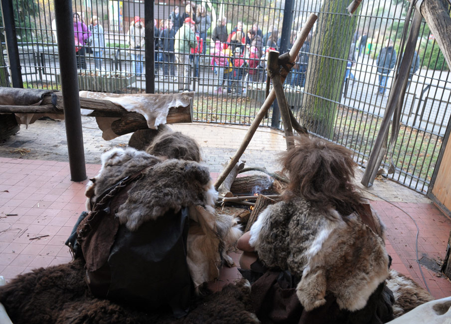 11月27日,波蘭首都華沙動物園里,一男一女兩個志愿者扮成原始洞穴人向參觀者進行展示。圖片來源:中國新聞網