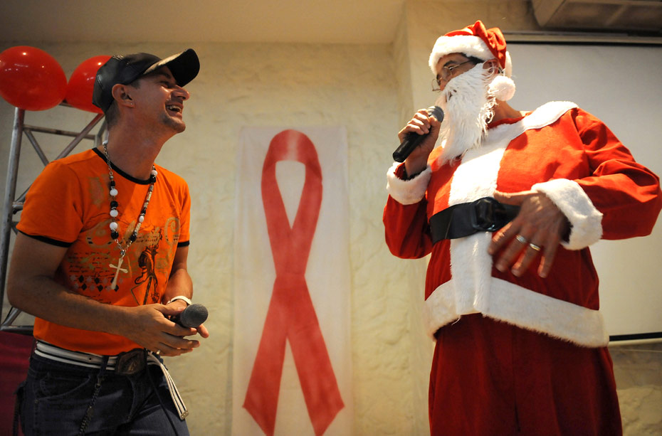 圖為哥倫比亞一位“圣誕老人”在為艾滋病日做宣傳。12月1日是世界艾滋病日,2009年世界艾滋病日的主題是“普遍可及和人權”。世界各地民眾組織各種活動呼吁人們關注艾滋病。圖片來源:中國新聞網(wǎng)